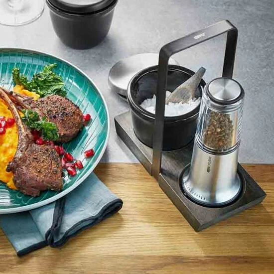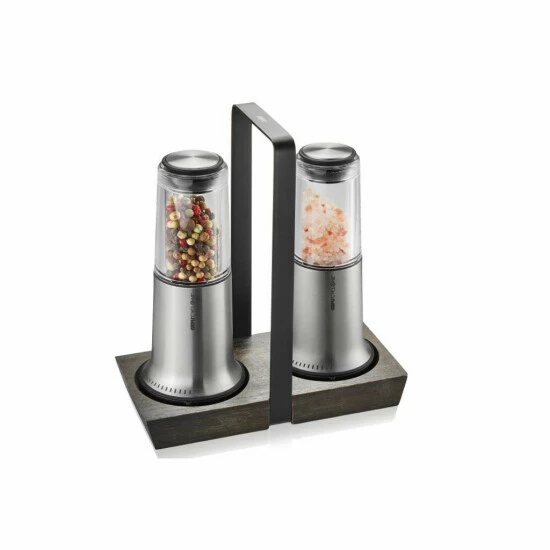 Diese edle Menage ist der perfekte Partner für alle X-PLOSION Mühlen der Größe M, den Chilischneider, die Salz- und Gewürzdosen oder auch die Essig- Öl Spender. Sie besticht durch edles Akazienholz, eine hochwertige Verarbeitung und einen praktischen Tragegriff.