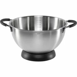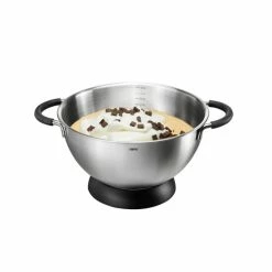 Auf dem schwarzen Kunststofffuß hat die Rühr- und Schlagschüssel MESCO aus hochwertigem Edelstahl sicheren Stand, wenn ein Teig verknetet oder eine feine Dessertcreme aufgeschlagen werden soll. Auch zum Vermengen von Salat ist die 4 Liter fassende, spülmaschinenfeste Schüssel mit der praktischen Innenskalierung genau richtig! Außerdem eignet sie sich hervorragend zum Schmelzen von Schokolade oder zum Aufschlagen einer Zabaione über dem Wasserbad. Die handlichen Schüsselgriffe sind mit einer schwarzen Silikonschicht ummantelt – so hat man sie auch mit feuchten Händen bestens im Griff!