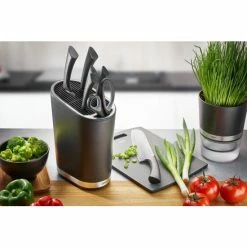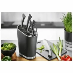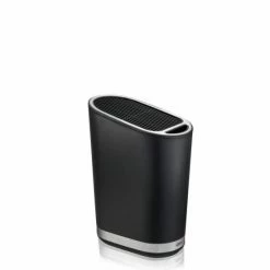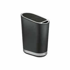 So elegant hält man heute Messer jederzeit griffbereit. Der schwere Messerblock in edlem Schwarz mit glänzenden Edelstahlkanten bietet 28 sichere Fächerschlitze für Messer unterschiedlichster Größen sowie ein großes Frontfach für Wetzstahl oder Küchenschere.