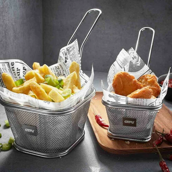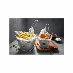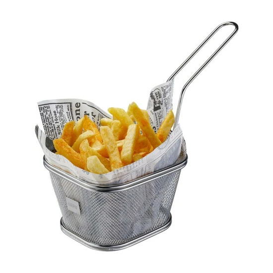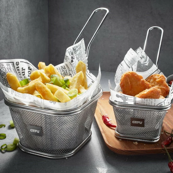 Mit dem edlen Mini-Servierkorb kann man frisch Frittiertes so perfekt anrichten wie im Restaurant. Ob Pommes, Kartoffelwedges, Zwiebelringe, Shrimps oder gegrilltes Gemüse: alles sieht doppelt lecker und besonders appetitlich aus. Da freut sich die Familie und Ihre Gäste werden begeistert sein.