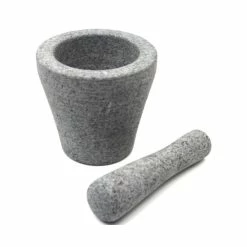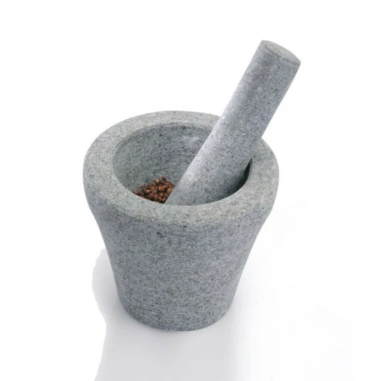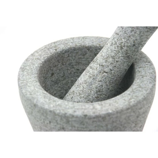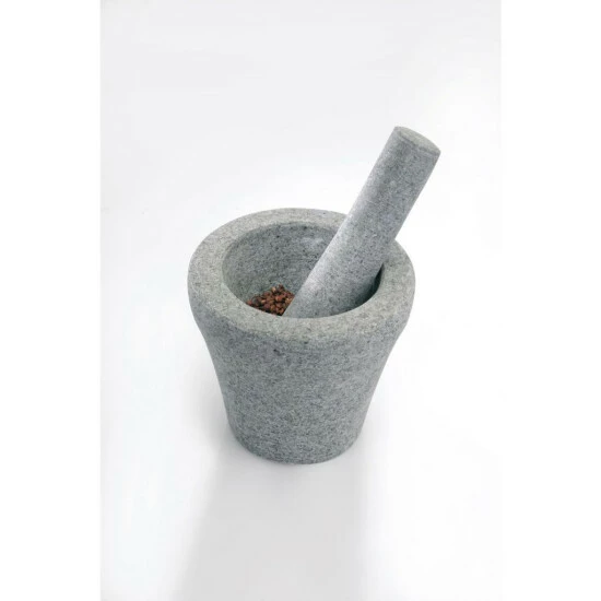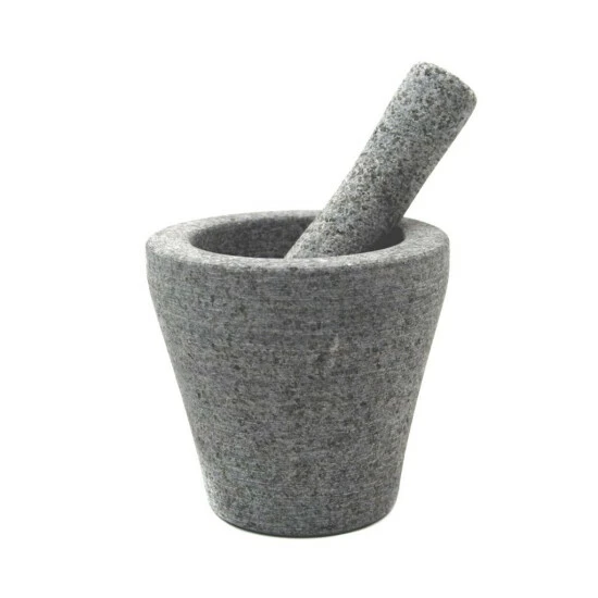 Dieser Mörser besteht ebenso wie der Stößel aus Granit und eignet sich ideal zum Zerstoßen von Gewürzen. Der gerundete Boden erleichtert die Zubereitung von Kräuterpasten oder Pesto.