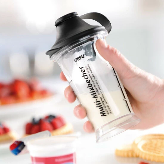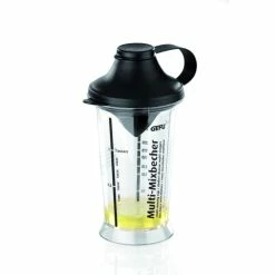 Der Multi-Mixbecher hat es im wahrsten Sinne des Wortes in sich, denn er ist ein wahres Allroundtalent. So eignet er sich dank seiner detailliert aufgedruckten Skala mit verschiedensten Maßeinheiten nicht nur zum unkomplizierten Abmessen, sondern ist auch perfekt zum Mixen und Zubereiten von z.B. Marinaden, Saucen, oder Dressings. Zum Sahneschlagen ist sogar die maximale Einfüllmenge angegeben.