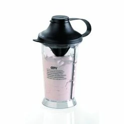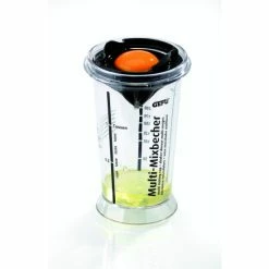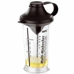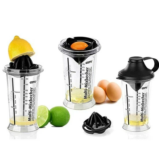 Zitronen pressen, Eier trennen, Marinaden zubereiten. Der Multi-Mixbecher von Gefu vereint mehrere Küchenutensilien in einem. Der Becher besteht aus transparentem Kunststoff und fasst bis zu 300 ml Flüssigkeit. Der Clou ist sein multifunktionaler Einsatz aus schwarzem Kunststoff. Auf der einen Seite findet sich eine Zitruspresse, die sich durch Umdrehen in einen Trichter zum Trennen von Eiern verwandelt. Mit dabei ist außerdem ein Deckel (auch aus schwarzem Kunststoff), den Sie zum Mixen oder zum aromadichten Aufbewahren von Marinade, Vinaigrette etc. im Kühlschrank aufsetzen. Der Deckel ist mit einem Ausgießer sowie einem praktischen Verschluss versehen. Der Mixbecher verfügt über Skalen für unterschiedliche Maßeinheiten: ml, ccm, cups, fl und oz. Möchten Sie eine Vinaigrette oder eine Marinade herstellen, können Sie die flüssigen und festen Zutaten direkt im Becher abmessen und anschließend durchmischen. Der Becher verfügt über ein Fassungsvermögen von 300 ml. Auf der Skalierung ist außerdem die maximale Füllmenge für Schlagsahne eingetragen. Zur Herstellung von cremiger, nicht zu fester Schlagsahne setzen Sie einfach den Deckel auf und schütteln ordentlich. Auf diese Weise lässt sich auch luftiger Eischnee herstellen, nachdem Sie das Ei mit Hilfe des Trichters getrennt haben. Alle Teile lassen sich unkompliziert in der Spülmaschine reinigen.