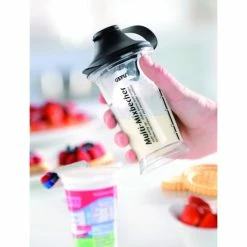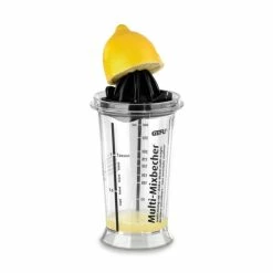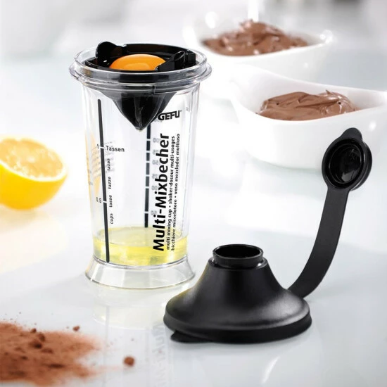 Besonders praktisch: Der Deckel verfügt über einen Ausgießer sowie einen zusätzlichen Verschluss. Doch damit nicht genug: Der patentierte Einsatz ermöglicht es sogar, den Multi-Mixbecher zum Auspressen von Zitronen und zum Trennen von Eidotter und Eigelb einzusetzen.