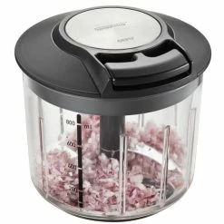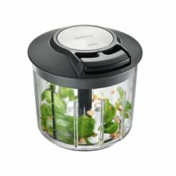 Effizientes und kraftsparendes Multitalent: durch den Seilzugmechanismus gelingt ein Zerkleinern, Pürieren, Mischen, Verquirlen und Rühren von verschiedensten Zutaten im Handumdrehen und kinderleicht. Je nach Länge der Anwendung können mit dem Schneideinsatz Möhren, Nüsse und vieles mehr von grober bis hin zu sehr feiner Konsistenz zerkleinert werden. Zwei sehr scharfe, geschwungene Klingen sorgen für ein optimales Resultat. Aber auch cremige Aufstriche und aromatische Salatdressings lassen sich im entsprechenden Einsatz vermischen, nachdem bspw. die Kräuter im Schleuderkorb getrocknet wurden. Die Rillen im Behälter sorgen dafür, dass das Schnittgut immer wieder zum Boden zurückgeführt wird. Eine praktische Skalierung hilft zudem beim Bemessen der Zutaten. Umfangreiches Zubehör, wie ein luftdichter Aufbewahrungsdeckel, begleitet den transparenten Behälter aus stabilem SAN-Material, der durch seinen Bodenring jederzeit einen rutschsicheren Stand beweist.