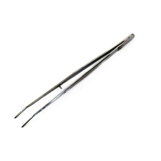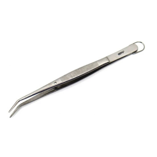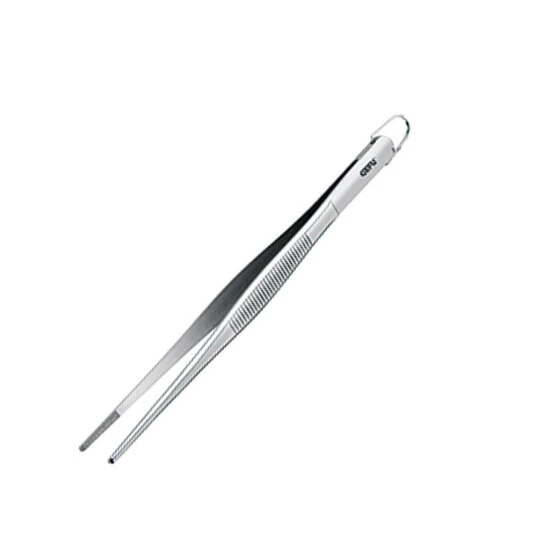 Kompakte Pinzette aus Edelstahl mit abgeschrägten Ende für viele Einsatzbereiche, besonders für die filigranen Arbeiten in der Küche.