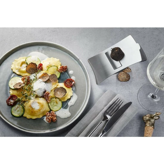 Gleichmäßige Scheiben von schwarzem Trüffel, aromatischem Wiesenchampignon oder dem gut gereiften Parmesankäse gewünscht? Dann sollte der Schlemmerhobel TARTUFOLO von GEFU zum Einsatz kommen! Er ist ein wendiger Helfer im Küchenalltag, die eine Seite hilft beim Käsehobeln, die andere liefert Scheibchen für Scheibchen Trüffel, Champignons oder auch Rote Beete für ein vegetarisches Carpaccio. Die Spezial-Edelstahlklinge sorgt für perfekte Hobelergebnisse. Der Trüffelhobel besteht aus hochwertigem Edelstahl und ist pflegeleicht spülmaschinengeeignet. GEFU Küchenwerkzeuge überzeugen durch ihre Funktionalität und ihre einfache Handhabung sowie ihr zeitloses, stilvolles Design. Die intelligenten Küchenartikel werden aus hochwertigen Materialien hergestellt und begeistern mit gleichbleibend hohen Qualitätsstandards. Mit den gut durchdachten und funktionalen Küchenwerkzeugen von GEFU verkürzen Sie oftmals zeitraubende Herstellungsphasen und lassen damit Raum für das Wesentliche: Die genussvolle Entdeckung der Kochkunst! Wir wünschen Ihnen viel Freude bei der Zubereitung und natürlich auch beim Genießen kulinarischer Köstlichkeiten mit dem exzellenten Schlemmerhobel TARTUFOLO von GEFU. Sie werden begeistert sein!