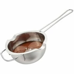 Die meisten traditionellen Desserts sind kaum vorstellbar, ohne ausdrucksstarke dunkle Schokolade zu verwenden. Ihre Verarbeitung erfordert jedoch angemessene Achtsamkeit und Genauigkeit. Mit Rücksicht auf Süßwaren von Amateuren und Profis entwarf der deutsche Hersteller ein spezielles Accessoire zum Schmelzen von Schokolade oder gedämpfter Butter. Ein langer Griff auf der einen Seite und ein spezieller Haken auf der anderen Seite ermöglichen es Ihnen, die Schüssel fest über das Wasserbad zu hängen. Während die Ausgießer, die das Ausgießen von geschmolzener Schokolade oder Kuverturen erleichtern, auf zwei Seiten angeordnet waren, ist das Accessoire ein universelles Produkt für Links- und Rechtshänder. Schokolade wird nie wieder brennen und Sie können Lorbeeren sammeln, damit der beste Schöpfer exquisite Desserts zubereitet.
