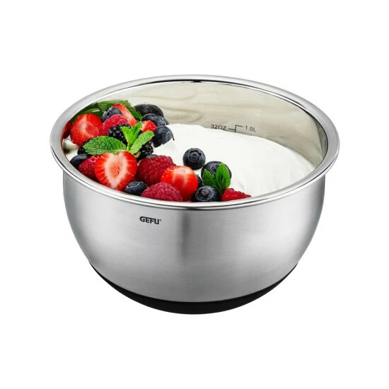 Dank des Bodenrings hat die Schüssel immer einen festen Stand und erleichtert Dir die Zubereitung von sämtlichen Leckereien. Innenliegend befindet sich eine Skalierung in ml / fl.oz mit der Du alles praktisch in der Schüssel abmessen kannst.