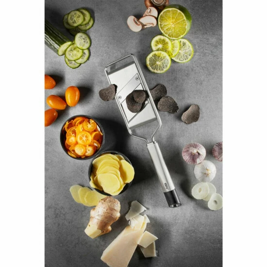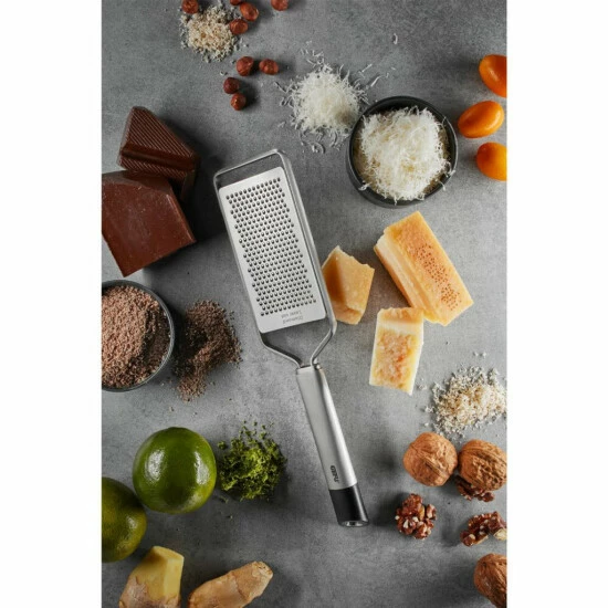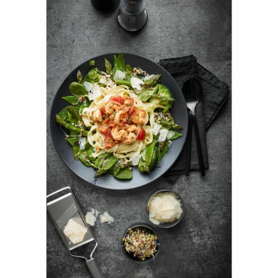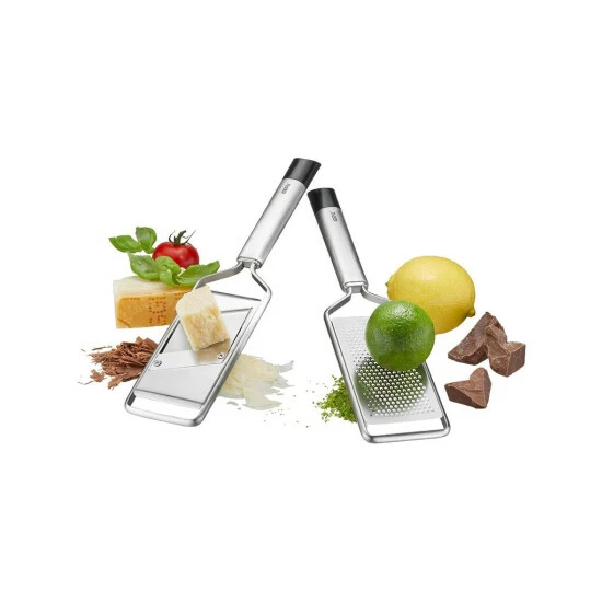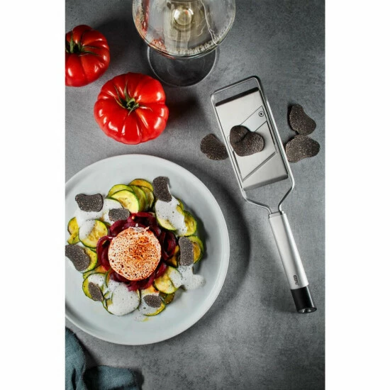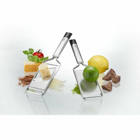 Klein, aber Oho: mit diesem Duo sind sie perfekt ausgestattet. Mit dem Gourmet-Hobel lassen sich feine Scheibchen von Trüffel, Parmesan, Champions oder Schokolade direkt auf Ihr Essen hobeln. Auch die kleine Feinreibe ist ideal für den Einsatz am Tisch – und frisch Geriebenes wie Hartkäse oder Schokolade, nach ganz persönlichem Gourmet-Gusto!