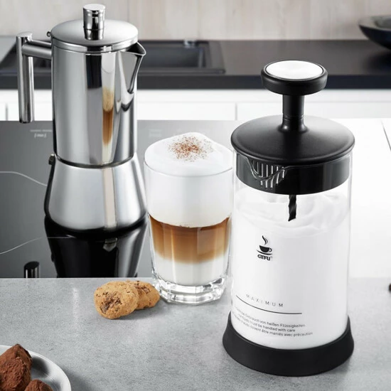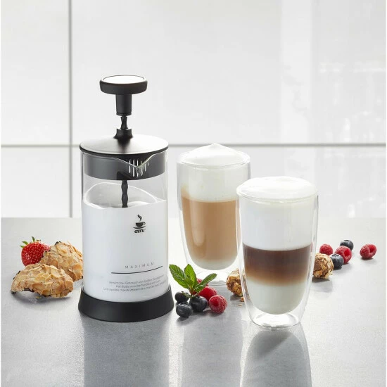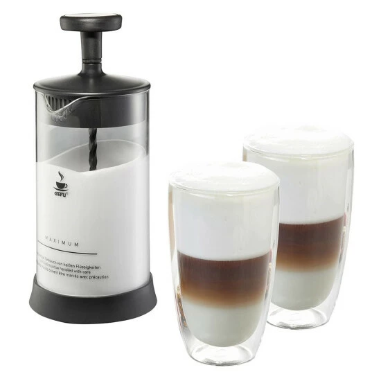 GEFU Set: Milchaufschäumer ANTONIO und 2 Latte Macchiato Gläser (je 350ml)