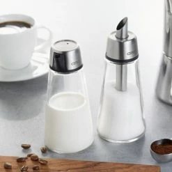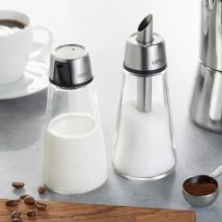 Set aus Milchkännchen und Zuckerspender in elegantem Design. Das Set besteht aus Glas mit einem Edelstahl-Aufsatz und Kunststoffeinsatz.