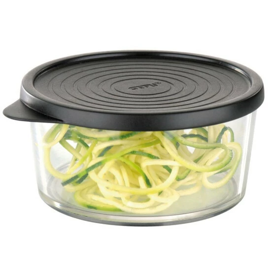Der Sprialschneider von Gefu schneidet jedes feste Wunschgemüse wie Kartoffeln, Zucchin, rote Beete, Zwiebeln, Paprika oder Kohrabi in köstliche Spiralen, die als Rohkost genossen werden können oder sich auch in Pfanne oder Topf weiterverabeiten lassen. Ganz nach Geschmack kann die Schnittbreite vierfach eingestellt werden. Für die Herstellung der leckeren Gemüsespiralen muss das Gemüse auf eine Höhe von maximal 8 cm zugeschnitten, Deckel aufklappen, Gemüse einsetzen, Deckel zu und das Schneidegeut durch Herunterdrücken der Kurbel fixieren und einfach loskurbeln. Das Tolle an dem Spiralschneider Sprialfix ist dabei, dass das Schneidegut naehzu restlos verarbeitet wird und in dem rutschfesten Auffangbehälter sicher und sauber aufgefangen wird. Dank des mitgelieferten Deckels kann der Auffangbehälter auch zur Aufbewahrung genutzt werden. Zur einfachen Reinigung kann der Sprialschneider Spiralfix auseinander genommen werden.