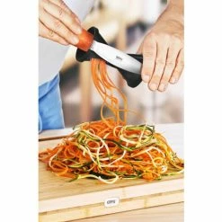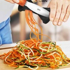 Gefu Spiralschneider Spirelli schneidet Gemüse in appetitliche Julienne – Endlos – Spiralen. Der Spiralschneider ist qualitativ gebaut mit japanischem Edelstahl – Messer und sehr hochwertigem Kunststoff. Das Prinzip des Anschneiders wird genutzt, um Möhren, Rettich, Gurken und sonstige Gemüsesorten im Handumdrehen in Endlos – Spiralen umzuwandeln. Zum säubern einfach in die Spülmaschine!