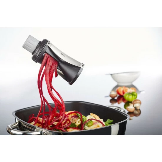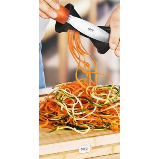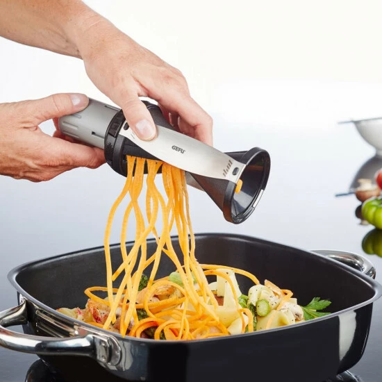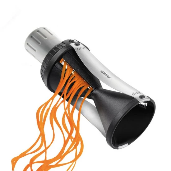 Der neue Spirelli 2.0 von Gefu ist da! Er schneidet Zucchini, Möhren, Gurken, Rettich und sogar Kartoffeln und Rote Beete mit einem Durchmesser von bis zu 6cm in trendige Julienne – Endlossstreifen. Einfach das Gemüse in den handlichen Trichter des Spirelli stecken, den neuen einrastenden Gemüsehalter mit drei Edelstahlspitzen aufstecken und das Gemüse – wie durch einen Bleistiftanspitzer – drehen. Der praktische nachschiebbare Stempel hilft dabei, das Gemüse bis zum letzten Dreh zu verarbeiten. Aktuell gibt es zwischen dem Spirelli 2.0 und ‘Fit for Fun’ eine ‘gesunde’ Kooperation und somit findest du auf dem Produkt auch das ‘Fit for Fun’-Logo.