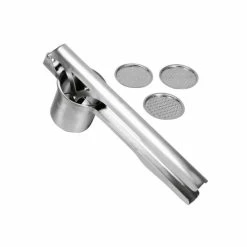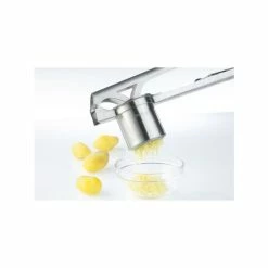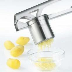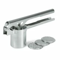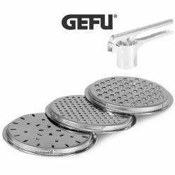 Die klassische Kartoffel- und Spätzlepresse TriStar” von Gefu eignet sich hervorragend zur Zubereitung von frischen Spätzle oder feinem Kartoffelpüree. Sie ist aus hochwertigem Edelstahl (18/10) gefertigt und dank ihrer drei auswechselbaren Scheiben universell einsetzbar. Die unterschiedlichen Lochungen (2,5mm, 3mm und eine Speziallochung) ermöglichen eine vielseitige Anwendung. Die Presse ist sehr leicht zu reinigen und sollte als Küchenwerkzeug auch in Ihrem Haushalt nicht fehlen. Das sehr stabile Gerät mit dem schweren, starken Presshebel erleichter die Arbeit – auf Profi-Niveau. Die Lochscheiben rasten gut ein und sind schnell und bequem auszuwechseln. “