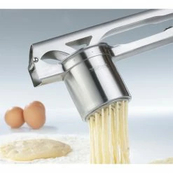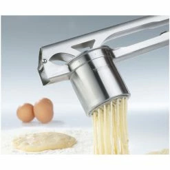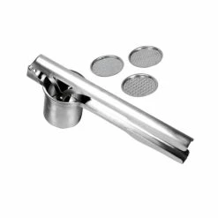 Material: Edelstahl Maße: ca. 10 x 28 x 10 cm Farbe: silberfarben Mit einer Lochung von 2,5 mm, 3 mm und mit einer Speziallochung für Spätzle Geeignet für Kartoffeln, zum Zubereiten von Nudeln oder für Spaghetti-Eis Lieferumfang: 1 x Kartoffelpresse, 3 x auswechselbare Scheiben