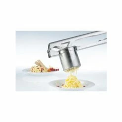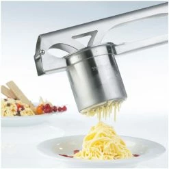 Ergonomische Form für optimale Handhabung. Großes Fassungsvermögen, zerlegbar für leichte Reinigung. Ideal auch als Presse für Obstsäfte, Kartoffelpüree, Spaghetti-Eis etc. Alu-Druckguss beschichtet.