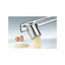 Das sehr stabile Gerät mit dem starken Presshebel macht das Arbeiten leicht und professionell. Mit 2,5 mm Lochung zum Pürieren von Kartoffeln, Gemüse und Obst, mit 3,0 mm Lochung als Düse für lange Spätzle und Spaghetti-Eis und mit Speziallochung für Spätzle, die aussehen wie handgeschabt. Maße: L/B/H 35 x 15 x 8 cm
