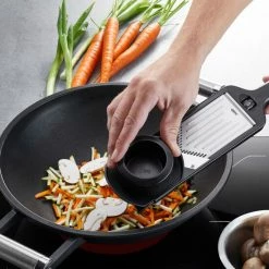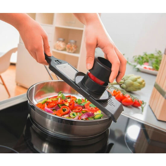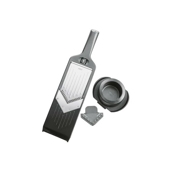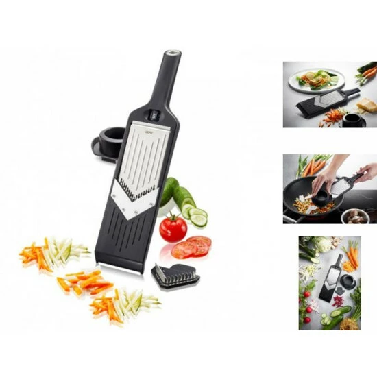 einstellbare Schnittstärken von 1 – 5 mm - zwei Klingeneinsätze für Juliennestreifen von 3 und 6 mm Breite