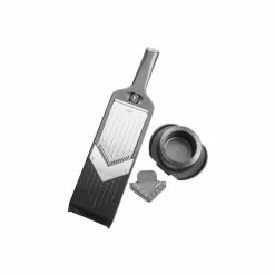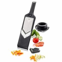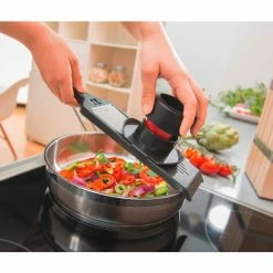 Die GEFU Mandoline VIOLI 2.0 eignet sich ideal zum Schneiden von Gemüse und Obst. Der ergonomische Griff liegt angenehm in der Hand. Ein weiterer Vorteil der Gemüsereibe ist die Wahl von 5 verschiedenen Dicken zum Schneiden von Scheiben. Sie hat auch zwei zusätzliche Messereinsätze für noch feinere Scheiben. Die Gemüsereibe besteht aus Edelstahl und ist spülmaschinenfest.
