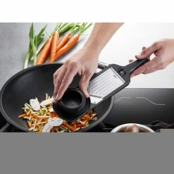 Kompakter, scharfer Hobel mit V-förmiger Klinge, Restehalter und Julienneeinsätzen.