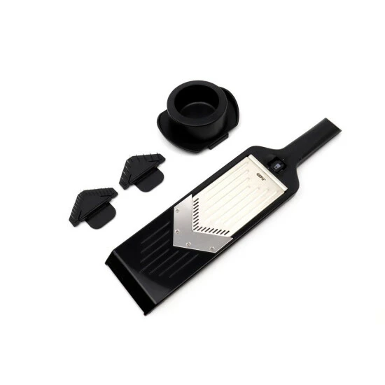 Der V-Hobel von Gefu verfügt über 5 einstellbare Schnittstärken für Scheiben zwischen 1 – 5 mm. Zwei Klingeneinsätze aus japanischem Klingenstahl sorgen für perfekte Juliennenstreifen mit einer Breite von 3 mm und 6 mm. Die austauschbaren Klingeneinsätze lassen sich sicher in der mitgelieferten Aufbewahrungsbox verstauen. Ein Restehalter und die praktischen Anti-Rutschfüße bieten zusätzliche Sicherheit.