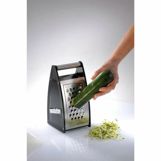 - vier unterschiedliche Reibflächen: fein, mittel, extra grob und Gurkenhobel