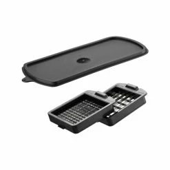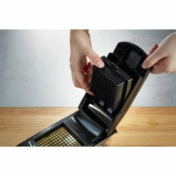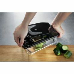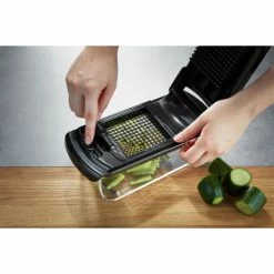Schneller und bequemer kann man Obst und Gemüse nicht in bunte Würfel und vielseitig verwendbare Stifte verwandeln. Extrascharfe Messereinsätze sorgen für müheloses Schneiden und gleichmäßige Resultate – von fein für gesunde Rohkost oder Suppeneinlagen bis grob für Pommes Frites oder leckere Eintöpfe. Perfekt auch zum Würfeln von Fetakäse.